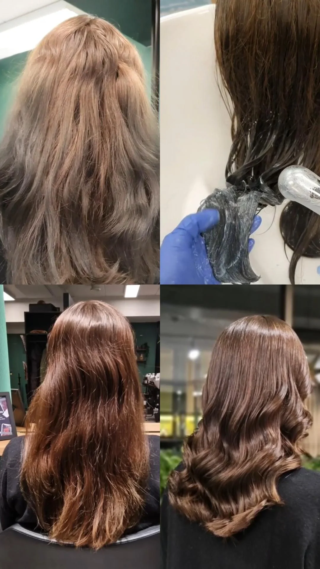 Tässä kuvasarjassa mustaksi latvaan kertynyttä indigoa on vaalennettu perinteisellä vaalennusaineella. Vihreää pigmenttiä nousi esiin ja sitä neutraloitiin jokaisella kampaamokäynnillä. Alemmissa ennen/jälkeen kuvissa näkyy, kuinka ajan saatossa sävy pehmeni ja kokonaisuutta värjättiin pehmeämmän ruskeaksi. (Pahoittelen kuvalaatua, sillä kuvat on napattu vanhemmasta videosta.)