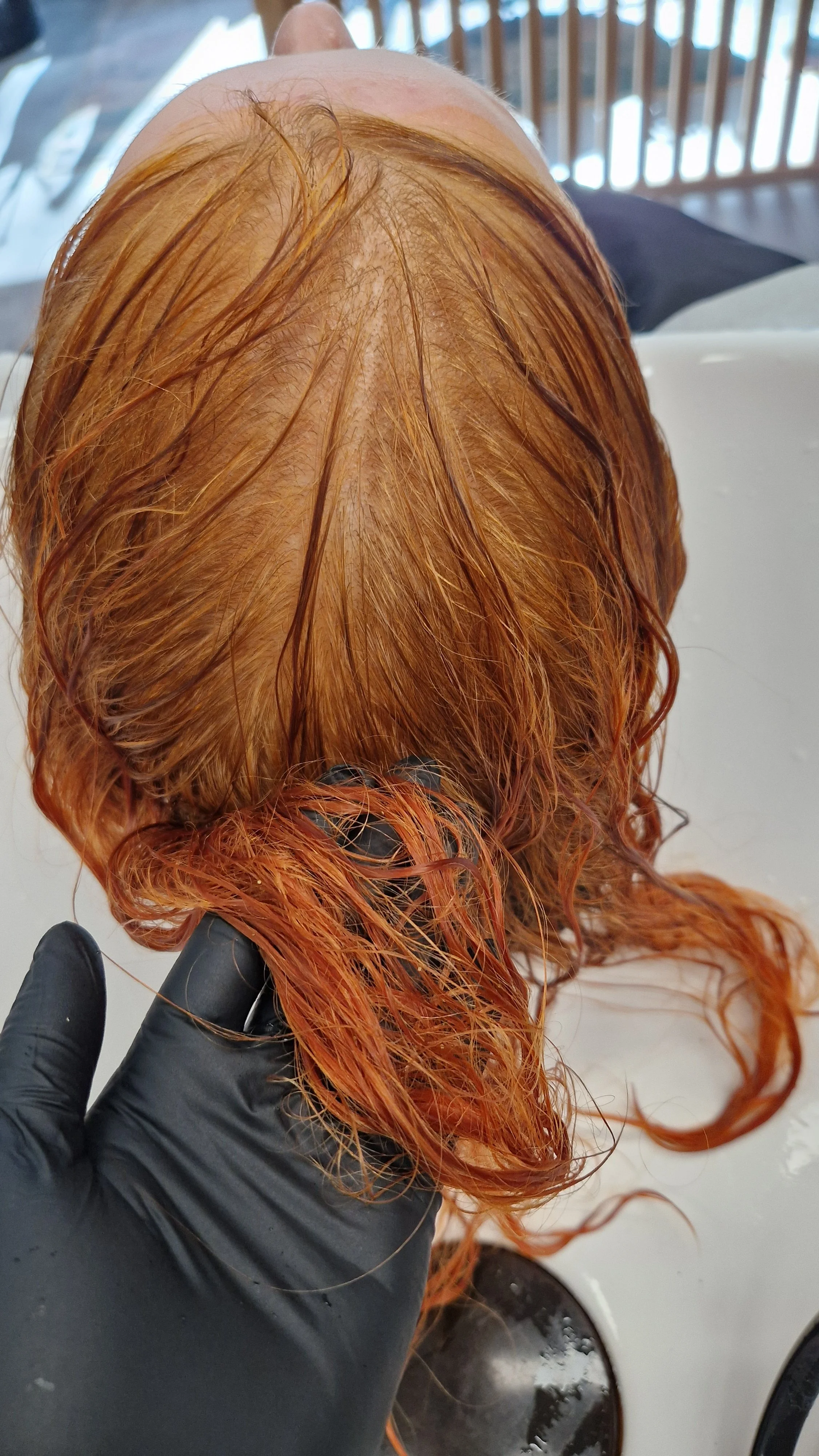 Esimerkki hennapohjan vaalennuksen aloituksesta. Henna oli kerrostunut hiuksiin vuosien varrella.